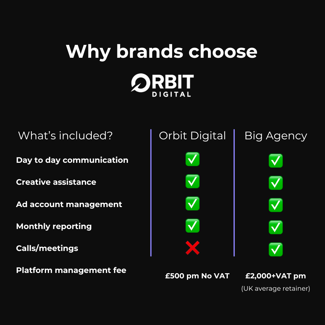 Scaling your brand is important, but not many start-ups can afford the pace or fees of a good agency. That's why at Orbit Digital collaborate with the big agencies to get brands off the ground with all of the amazing things you get from a good agency, for a fraction of the price.